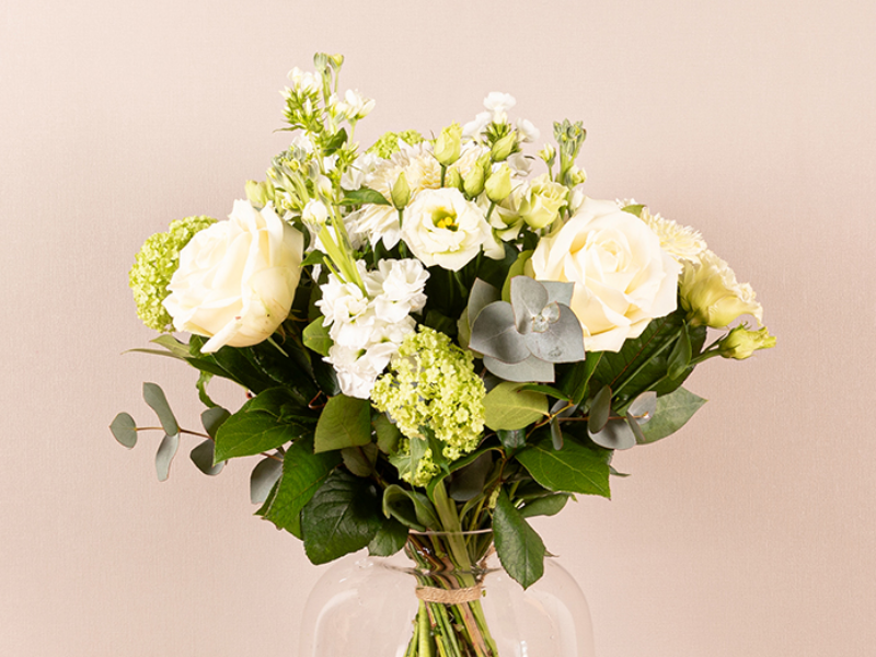 Rustig en compact wit-groen boeket, harmonieus en vol gebonden.
