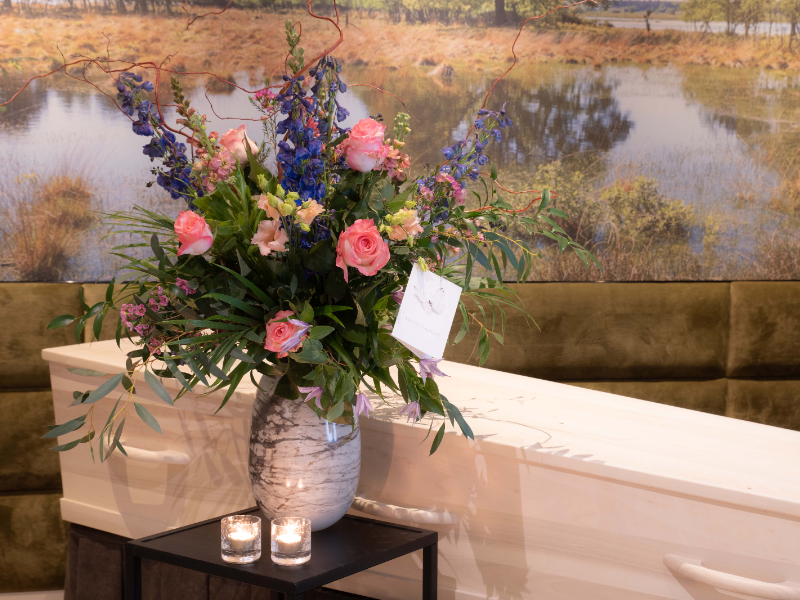 Boeket dat standaard in een bijpassende vaas worden geleverd om bij de kist van de overledene te plaatsen.