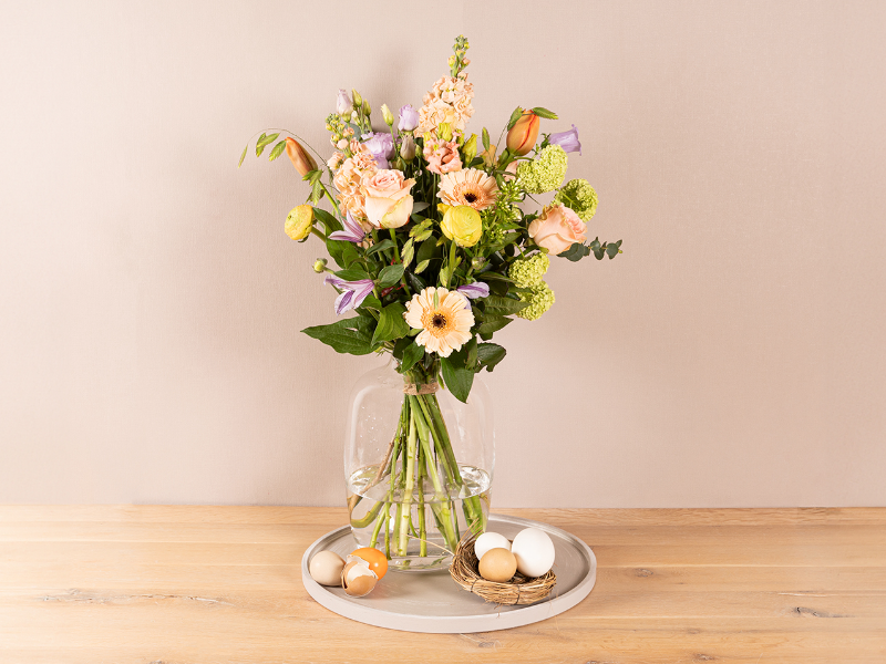 Dit paasboeket is leverbaar in de BloemenboxX met de speciale themakaart 'Fijne Paasdagen'. De BloemenboxX is een unieke geschenkverpakking met duurzaam materiaalgebruik. Bloemen staan constant op water en het is makkelijk in het vervoer.